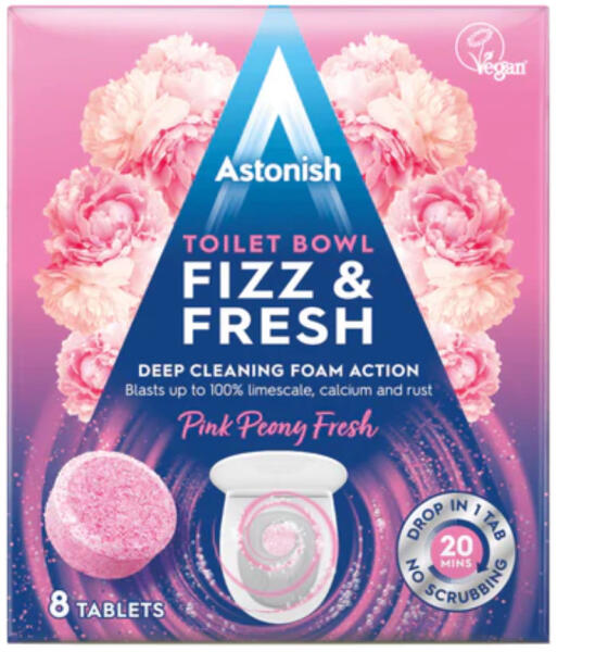 Az Astonish Fizz&Fresh WC tabletta kifejezetten a makacs lerakódások súrolás nélküli kezelésére lett kifejlesztve. Könnyedén eltávolítja a vízkövet, a kalciumot és a rozsdát.