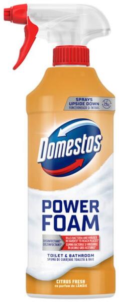 Domestos fertőtlenítő spray, Citrus, 435ml A Domestos Power Foam Spray Tisztítóhab citrom illattal 435 ml egy hab formájú fertőtlenítő termék WC és fürdőszoba tisztítására, amely a legnehezebben elérhető helyeken is eltávolítja a baktériumokat és vírusokat (Eltávolítja a baktériumokat, mint az E. Coli, S. Aureus, E. Hirae, P. Aeruginosa és burkos vírusok, például Vaccinia ATCC VR-1549). Kifejezetten úgy tervezték, hogy működjön és visszatérjen az utolsó csepphez, ez a termék könnyen használható és sokkal kényelmesebb;Az aktív hab könnyen beborítja a felületeket a szennyeződések és a vízkő eltávolítása érdekében;Alkalmas mind a WC csésze, mind a mosható felületek tisztítására a fürdőszobában;A citrom illatú változat biológiailag lebomló, citrusos illatú, klórszag nélkül. Hozzávalók: