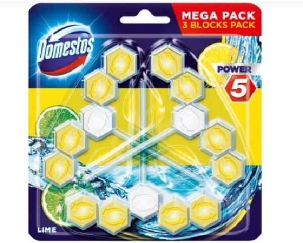 Domestos Power 5 merev WC-blokk az intenzív ápoláshoz minden öblítésnél. Összetétel:30% vagy több anionos felületaktív anyag, legalább 5%, de kevesebb, mint 15% nemionos felületaktív anyag, 5% alatti parfüm, aromás szénhidrogének, foszfátok,  Biztonsági információk:Súlyos szemkárosodást okoz. Bőrizgató hatású. Ártalmas a vízi élőlényekre, hosszan tartó károsodást okoz. Gyermekektől elzárva tartandó. Kerülni kell, hogy a környezetbe kerüljön. környezet. Viseljen védőszemüveget/arcvédőt. Bőrrel való érintkezés esetén: Mossuk le bő vízzel. Szembe kerülés után: Több percig tartó óvatos öblítés vízzel. Ha kontaktlencsét visel, lehetőség szerint távolítsa el. Folytassa az öblítést. Egészségügyi aggályok esetén hívja a mérgezési központot/orvost. Bőrirritáció esetén forduljon orvoshoz/ellátáshoz. A tartalom/tartály ártalmatlanítása önkormányzati vagy különálló helyen hulladék.