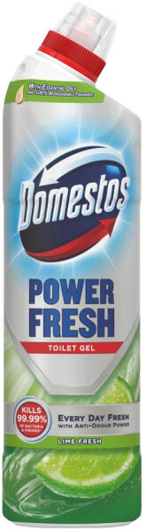 Domestos Power Fresh; WC tisztító gél termékcsalád biológiailag lebomló illatanyaggal és kellemetlen szag-semlegesítő hatással. Elpusztítja a baktériumok 99,9%-át, eltávolítja a makacs szennyeződéseket, mint a vízkő-lerakódásokat, friss és kellemes illatot hagyva a WC-ben.