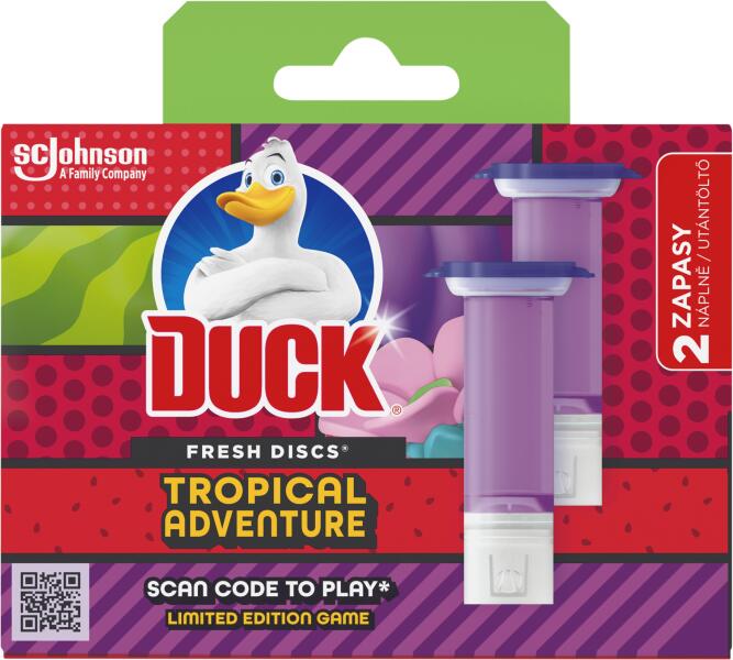 Egzotikus frissesség minden öblítéssel – a Duck Fresh Discs Tropical Adventure élénk, trópusi illattal és tartós higiéniával gondoskodik a WC tisztaságáról.