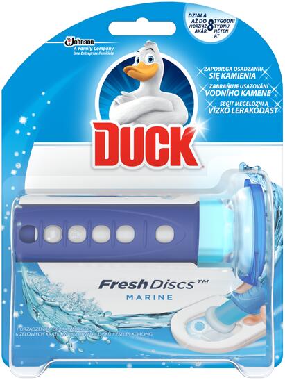 Higiénikus használatA Duck Fresh wc tisztító korong utántöltő lime illatával garantálja a higiénikus használatot, és a vízkőmentes tisztaságot a WC akár 720 öblítésen keresztül. A különleges formula egy öbíltésre aktiválódó védőréteget képez a csészében, mely gátolja a vízkő lerakódását.