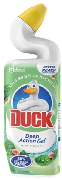 A menta illatú Duck Deep Action fertőtlenítő WC-tisztító gél megöli a baktériumok 99,9 %-át. Különleges, ívelt nyaknak köszönhetően a perem alatti rész is könnyedén elérhető, tisztaságot és friss illatot biztosít a toalettben.