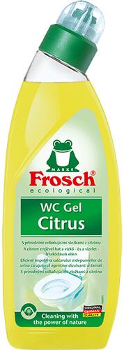 A Frosch WC Tisztító gél Citrus, természetes citromkivonattal még hatékonyabban oldja a vízkövet és a szennyeződéseket, kellemes illatot hagyva maga után. Hatékonyan távolítja el a szennyeződéseket, a vízkövet és a vizeletlerakódásokat még a perem alól is. Formulája a természetes eredetű citromkivonattal még a legmakacsabb vízkőlerakódásokat is eltünteti, és ragyogóan tiszta felületet biztosít. Alkalmazása: vidd fel a gélt a tisztítandó felületre, majd hagyd hatni néhány percig. Ezután WC kefével súrold át a  WC csészét és öblítsd le vízzel. Összetevők: < 5% anionos felületaktív anyagok, illatanyagok. További összetevők: citromsav, biológiailag lebomló sűrítőanyag, ételszínezékek.